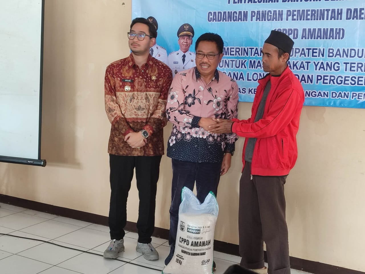 Penyaluran bantuan Beras Premium Cadangan Pangan Pemerintah Daerah (CPPD) AMANAH sebagai salah satu penanganan pasca banjir, pergerakan tanah dan tanah longsor di Desa Sukamanah, Cinengah, Bojong, Sukaresmi, dan Desa Cibitung se kecamatan Rongga.