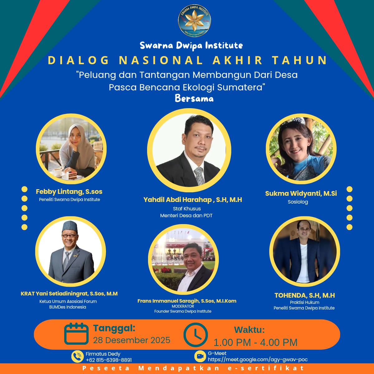 Jakarta, Berita Jejak Fakta –Dalam menyambut akhir tahun 2025, Swarna Dwipa Institute menggelar dialog nasional bertema Peluang dan Tantangan Membangun dari Desa Pasca Bencana Ekologi Sumatera, Minggu (28/12/2025) pukul 13.00 -16.00 di Jakarta.